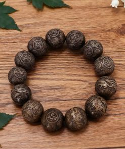 Vòng tay gỗ đàn hương đen 2 cm, hạt tròn khắc họa tiết