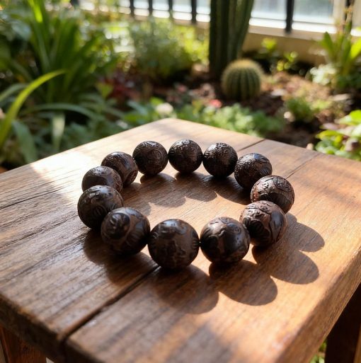 Hoàn thiện phong cách tối giản với vòng tay gỗ đàn hương đen – hạt lớn khắc họa tiết nổi bật, đeo êm tay và dễ phối cùng đồng hồ hoặc trang sức khác cho cả đi làm lẫn dạo phố. May/xâu thủ công chỉn chu.